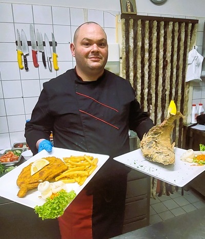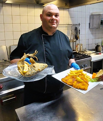 - Gebratener fränkischer Karpfen, - knuspriges Karpfenfilet mis hausgemachtem Kartoffelsalat, - cremige Kürbissuppe, - verschiedene Schnitzelvariationen und Balkan-Grill.